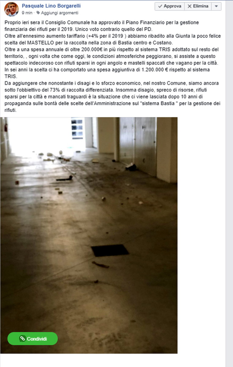 Da aggiungere che nonostante i disagi e lo sforzo economico, nel nostro Comune, siamo ancora sotto l’obbiettivo del 73% di raccolta differenziata. Insomma disagio, spreco di risorse, rifiuti sparsi per la città e mancati traguardi è la situazione che ci viene lasciata dopo 10 anni di propaganda sulle bontà delle scelte dell’Amministrazione sul “sistema Bastia ” per la gestione dei rifiuti.