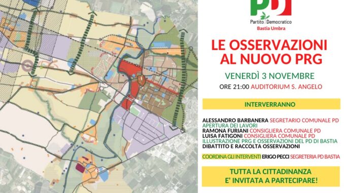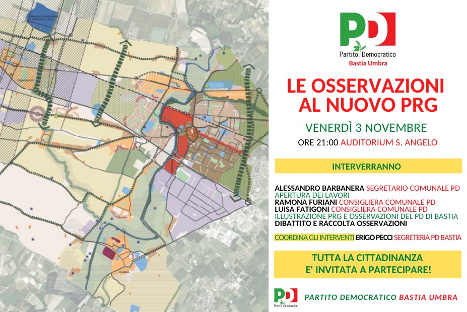 Pd Bastia Umbra – Il Partito Democratico di Bastia Umbra ha proseguito la serie di appuntamenti dedicati al dialogo e al confronto con l’obiettivo di informare la cittadinanza e contribuire alla costruzione di una proposta politica focalizzata per il territorio locale. In particolare, l’invito a partecipare all’incontro del 3 novembre presso l’Auditorium S. Angelo di Bastia Umbra ha l’obiettivo di promuovere una discussione aperta sul nuovo Piano Regolatore Generale e formulare insieme osservazioni da presentare al Consiglio.