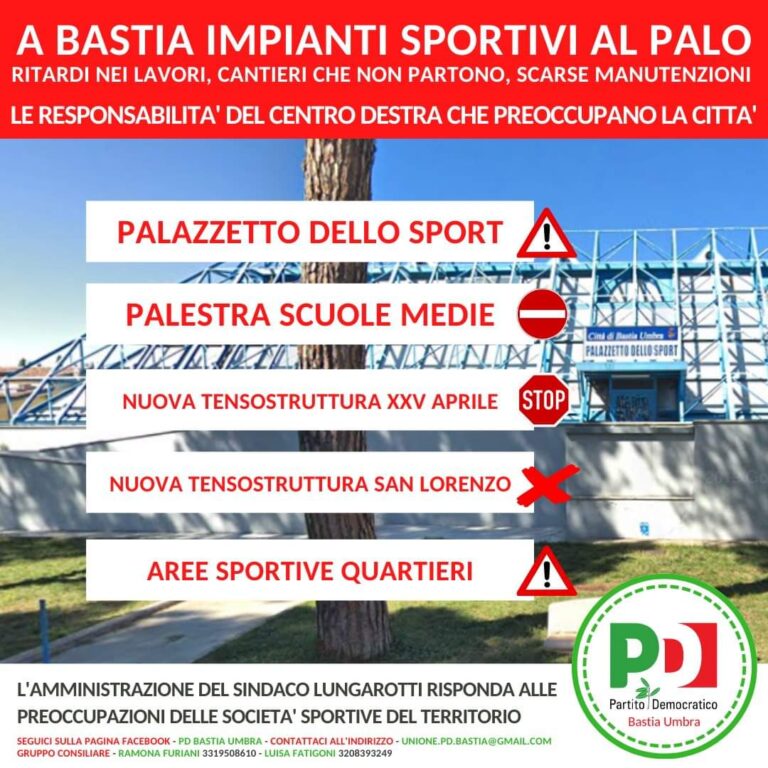 Riguardo il Palazzetto dello Sport di Viale Giontella stendiamo un velo pietoso: nel Consiglio Comunale del 26 ottobre 2021 è stato inserito nel piano delle opere pubbliche il contributo di 700 mila euro della Regione Umbria per la messa in sicurezza e la ristrutturazione dello stesso. La promessa era “una procedura rapida voluta dalla Giunta che intende mettere a nuovo il palazzetto entro l’estate 2022”. La realtà è davanti agli occhi di tutti e la domanda è: quando inizieranno i lavori? E si riuscirà a concluderli entro l’estate o si tratta dell’ennesima presa in giro nei confronti dei cittadini? Ad oggi la risposta appare impietosa davanti agli occhi di tutti.