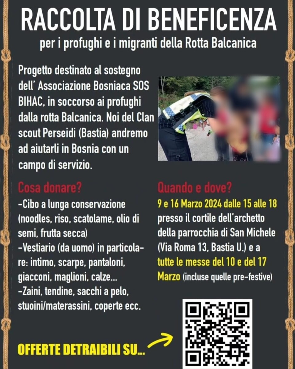 Dal 9 al 16 marzo dalle 15.00 alle 18.00 presso il cortile dell’archetto della Parrocchia di San Michele (Via Roma, 13- Bastia Umbra) e a tutte le messe del 10 e del 17 marzo incluse quelle (pre- festive) è stata realizzata una raccolta di beneficenza per andare in soccorso ai profughi dalla rotta balcanica.