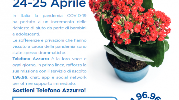 “Coltiva il seme della speranza riapriamo dall’infanzia”. Il Comune di Bastia Umbra ha aderito alla manifestazione solidale di Telefono azzurro che si svolge su oltre 1700 città italiane, prevista per sabato 24 e domenica 25 aprile 2021. Con un fiore possiamo aiutare ed essere vicini ai bambini e agli adolescenti in difficoltà e condividere un messaggio di speranza. Sosteniamo insieme la campagna solidale di raccolta fondi di Telefono Azzurro, con l’acquisto di una piantina di Calancola, allegra, colorata, vivace come il sorriso di un bambino.