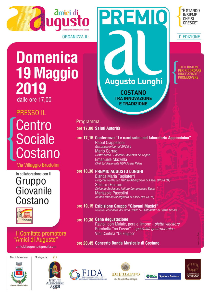 Domenica 19 Maggio 2019 a Costano di Bastia Umbra, presso il Centro Sociale (Via Villaggio Brodolini) si svolgerà il programma della manifestazione dedicata alla figura di Augusto Lunghi, tra i fondatori della Sagra della porchetta e responsabile della cucina della sagra stessa, purtroppo prematuramente scomparso nell’ottobre del 2016.