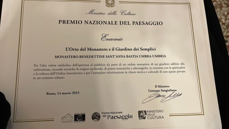 “In questa occasione – ha detto il Sindaco Paola Lungarotti – non posso che esprimere orgoglio e soddisfazione per questo encomio assegnato alla comunità benedettina che con tenacia mette a frutto non solo le risorse del patrimonio che ha saputo conservare egregiamente investendo risorse non indifferenti, frutto di duro lavoro prodotto dalle stesse monache, ma anche i preziosi documenti d’archivio custoditi gelosamente e che con cognizione di causa sono stati utilizzati nella redazione del progetto che è stato selezionato dal MIC tra 650 progetti presentati, ricevendo l’importante e prestigioso encomio tra i 70 ammessi”. La motivazione dell’assegnazione è la seguente: “Per l’alto valore simbolico dell’apertura al pubblico di un giardino adibito alla coltivazione, secondo tecniche di origine medievale, di piante aromatiche e alimurgiche, in coerenza con la spiritualità e la cultura dell’Ordine benedettino e per l’esemplare valorizzazione in chiave storica e culturale di uno spazio privato in un contesto urbano”. L’encomio consegnato a Madre Noemi Scarpa, reca la firma del Ministro Gennaro Sangiuliano.