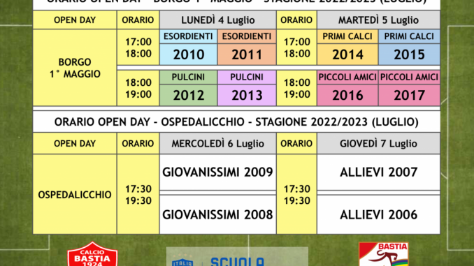 Il Bastia Calcio 1924 e l’Accademia Calcio Bastia organizzano il 4 e il 5 luglio presso gli Impianti Sportivi di Borgo I Maggio degli Open Day per le categorie Piccoli Amici, Primi Calci, Pulcini ed Esordienti e il 6 e il 7 luglio presso lo Stadio Gabrielli Ospedalicchio per le categorie Giovanissimi e Allievi.