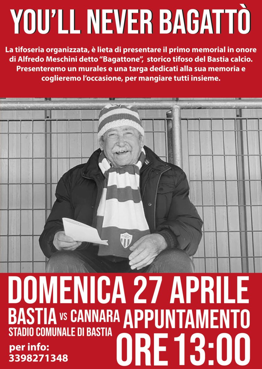 BASTIA UMBRA – Domenica 27 aprile ore 13, i tifosi organizzati bastioli, in occasione di Bastia – Cannara, organizzeranno un pranzo presso le ex biglietterie dello stadio, in piazza Armando Serlupini, per poi presentare un murales in onore di uno storico tifoso scomparso: Alfredo Meschini ma per tutti “Bagattone”. Il pranzo, aperto a tutti, sarà a base di salsicce, puntarelle e trecciola.