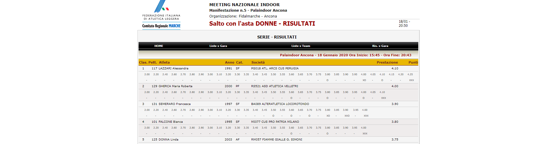 La gara si è tenuta il 18 gennaio al Palaindoor di Ancona. Si tratta del secondo meeting nazionale indoor di Atletica Leggera. Alessandra Lazzari ha 28 anni vive a Bastia e tesserata con la ARCS CUS PERUGIA. È stata 2 volte campionessa italiana Junior e Promesse di salto con l’asta