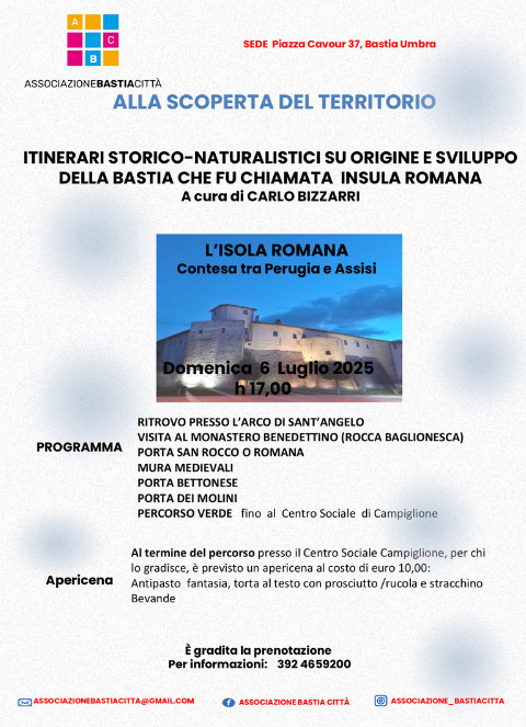Domenica 6 luglio, dalle ore 17.00, ritrovo presso l’Arco di Sant’Angelo Tante le curiosità, la storia locale e i personaggi. Programma: VISITA AL MONASTERO BENEDETTINO (ROCCA BAGLIONESCA) PORTA SAN ROCCO O ROMANA MURA MEDIEVALI PORTA BETTONESE PORTA DEI MOLINI PERCORSO VERDE fino al Centro Sociale di Campiglione.
